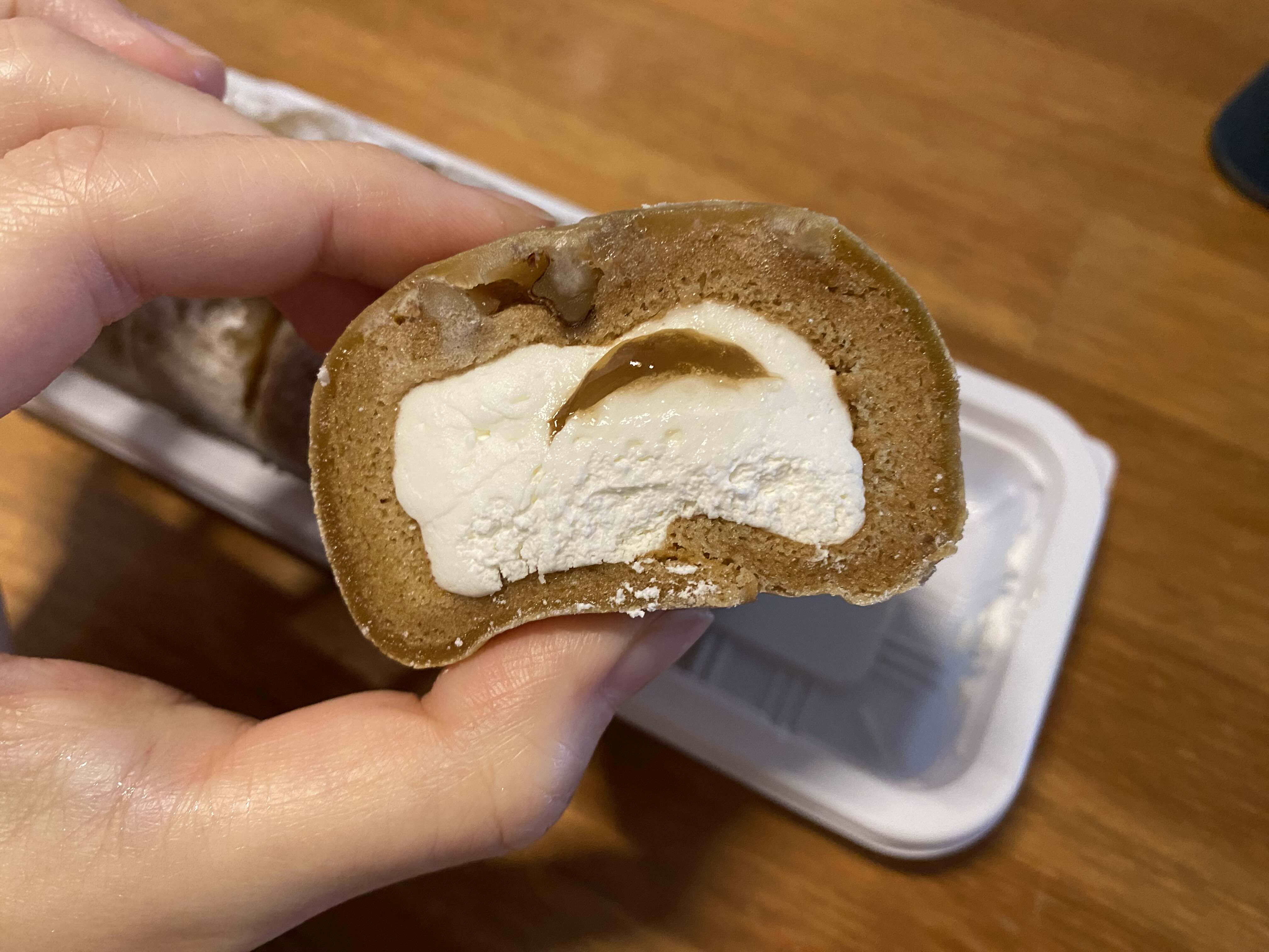 연한 호두마루 맛에 안에 호두가 들어가 있어 씹히는 맛도 있고 짭조름한 미타라시(간장 양념 / 소스)가 이 친구의 포인트랍니다. 간장소스라고 하면 거부감 들고 생소하신 분들도 잇으실 것 같은데 은근 잘 어울리는 조합이더라고요. 미타라시 당고를 그렇게 좋아하지 않는 저지만 이 모찌롤은 계속 손이 갔어요. 만약 미타라시 당고 좋아하시는 분들이라면 반드시 드셔보세요!