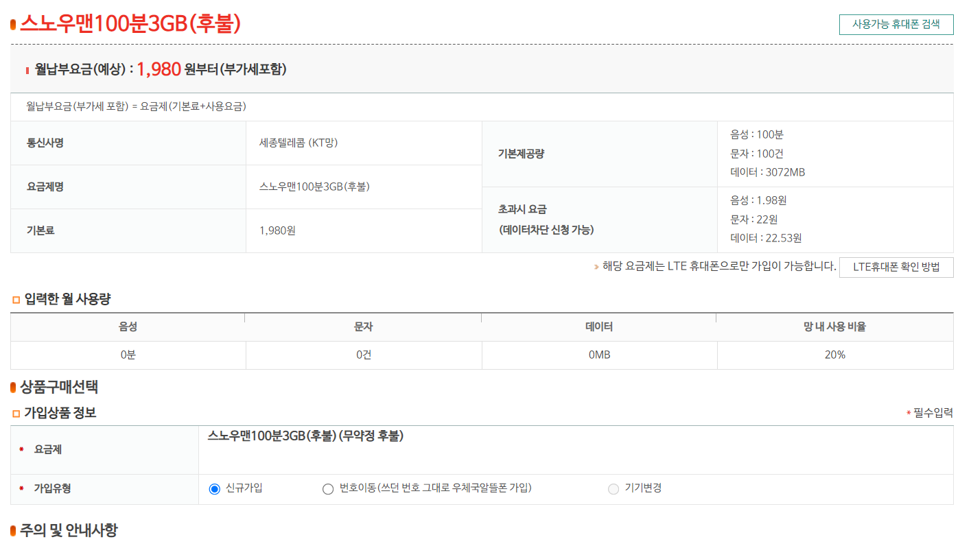 음성 100분, 문자 100통, 데이터 3GB인 스노우맨 100분 3GB(후불) 유심을 구매하기로 결정했어요.