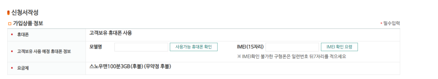 가입 시 사용할 핸드폰의 모델명과 IMEI 작성이 필수입니다.