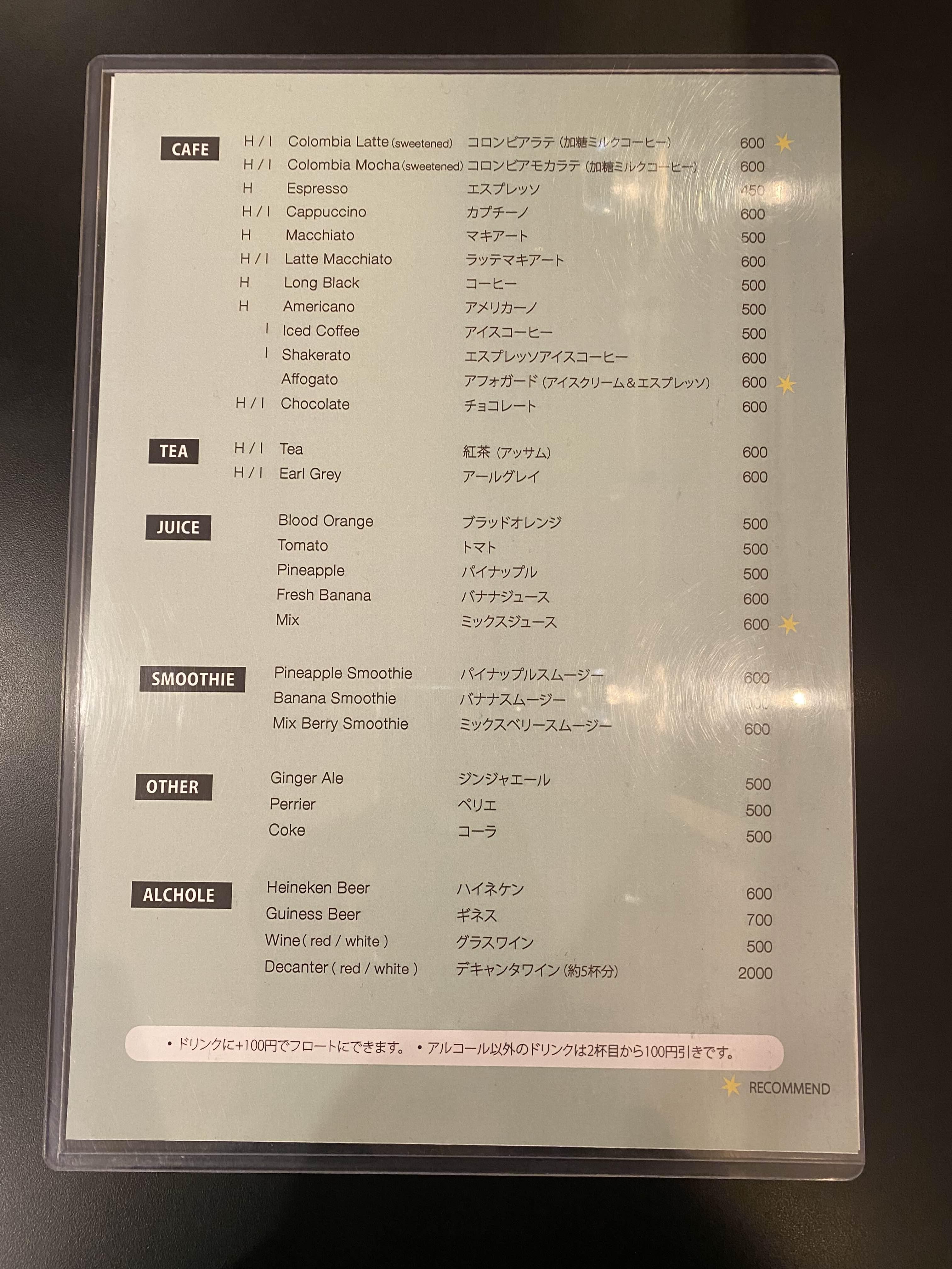 메뉴판에는 전메뉴 영어로도 표기되어 있어 일본어를 모르시더라도 쉽게 주문하실 수 있을 것 같아요. 저 중 금색 별 모양으로 표시되어 있는 콜롬비아 라테, 아포가토, 믹스주스 총 3개의 메뉴가 추천하는 친구들 같더라고요.