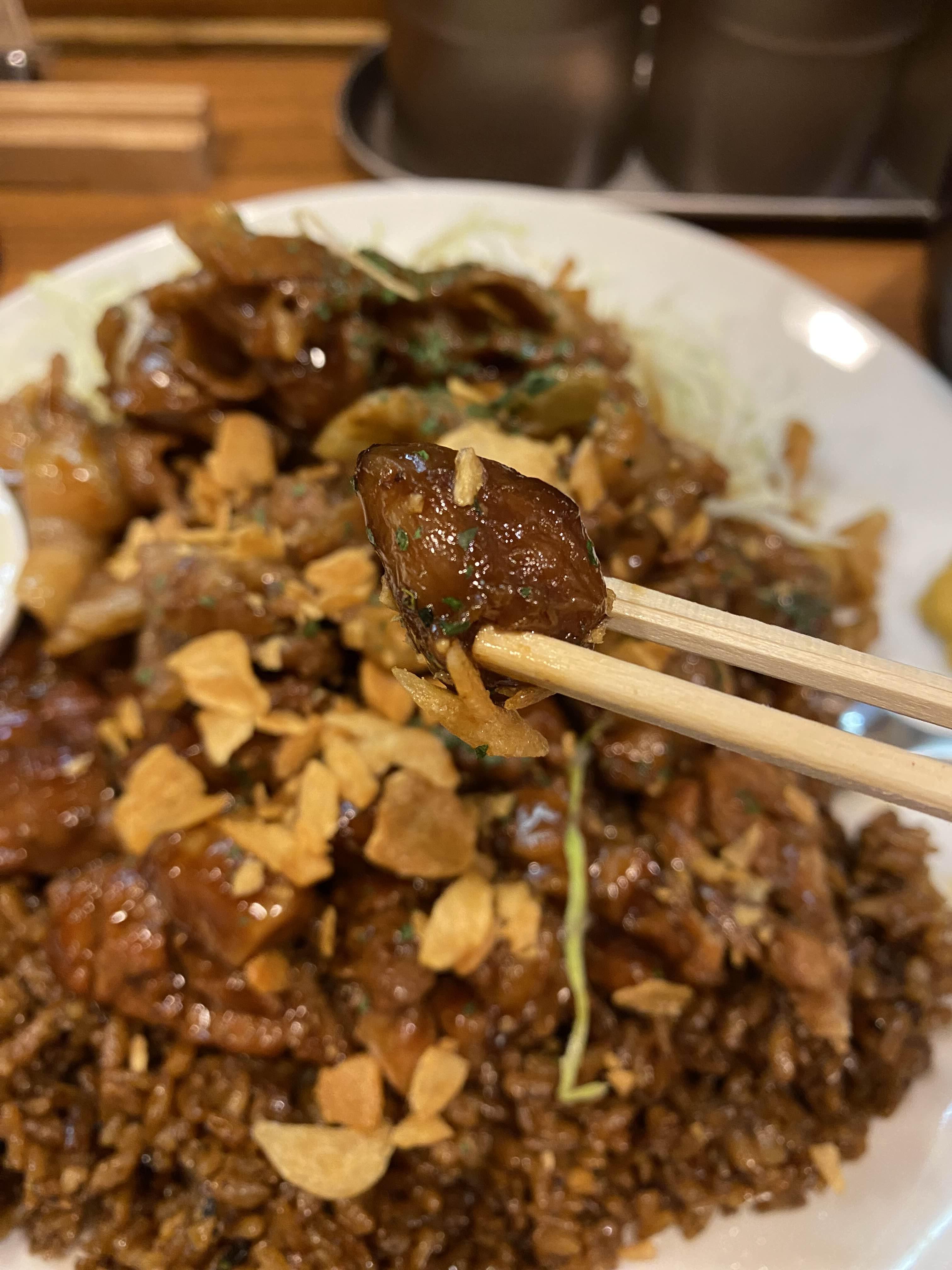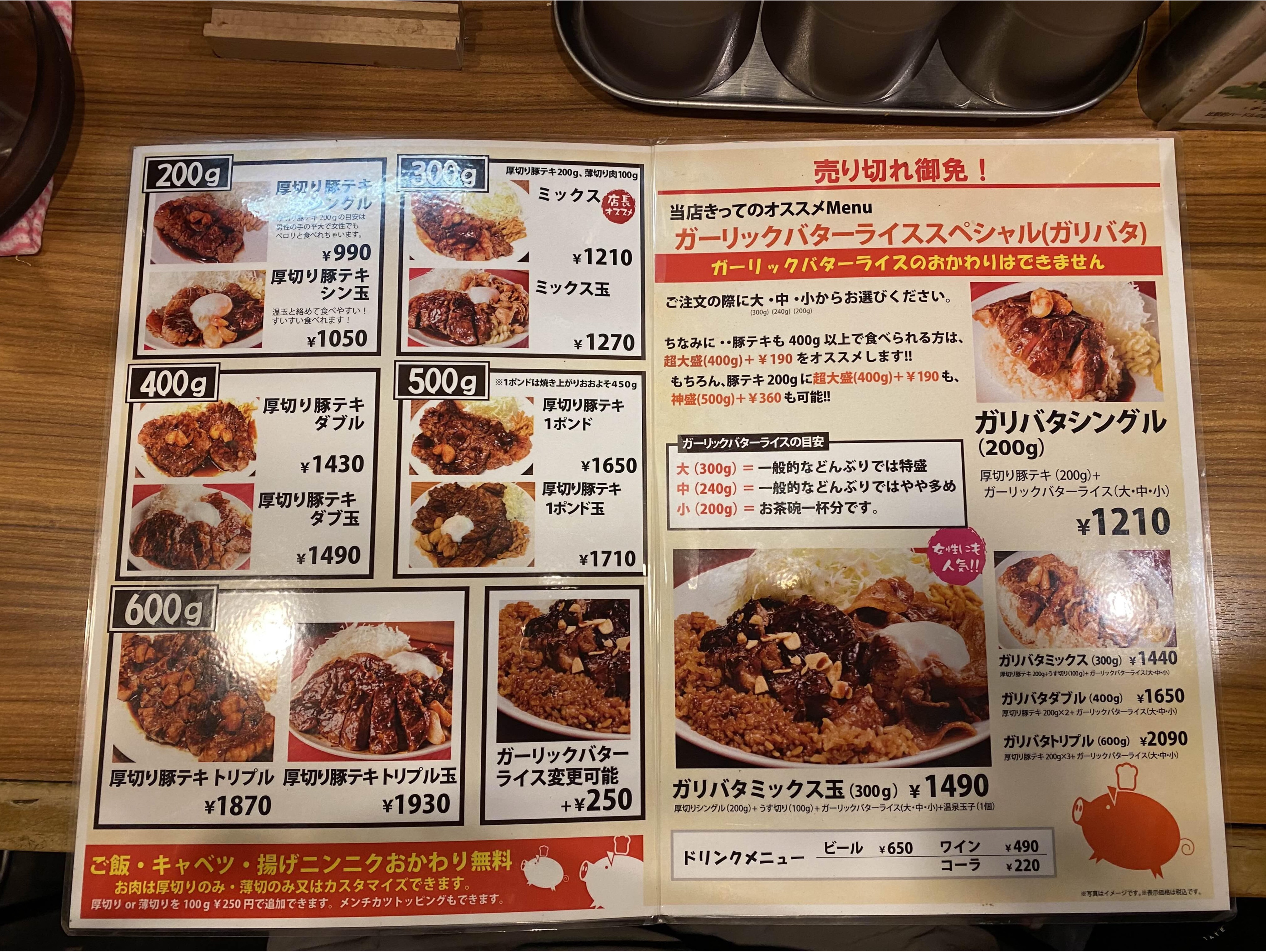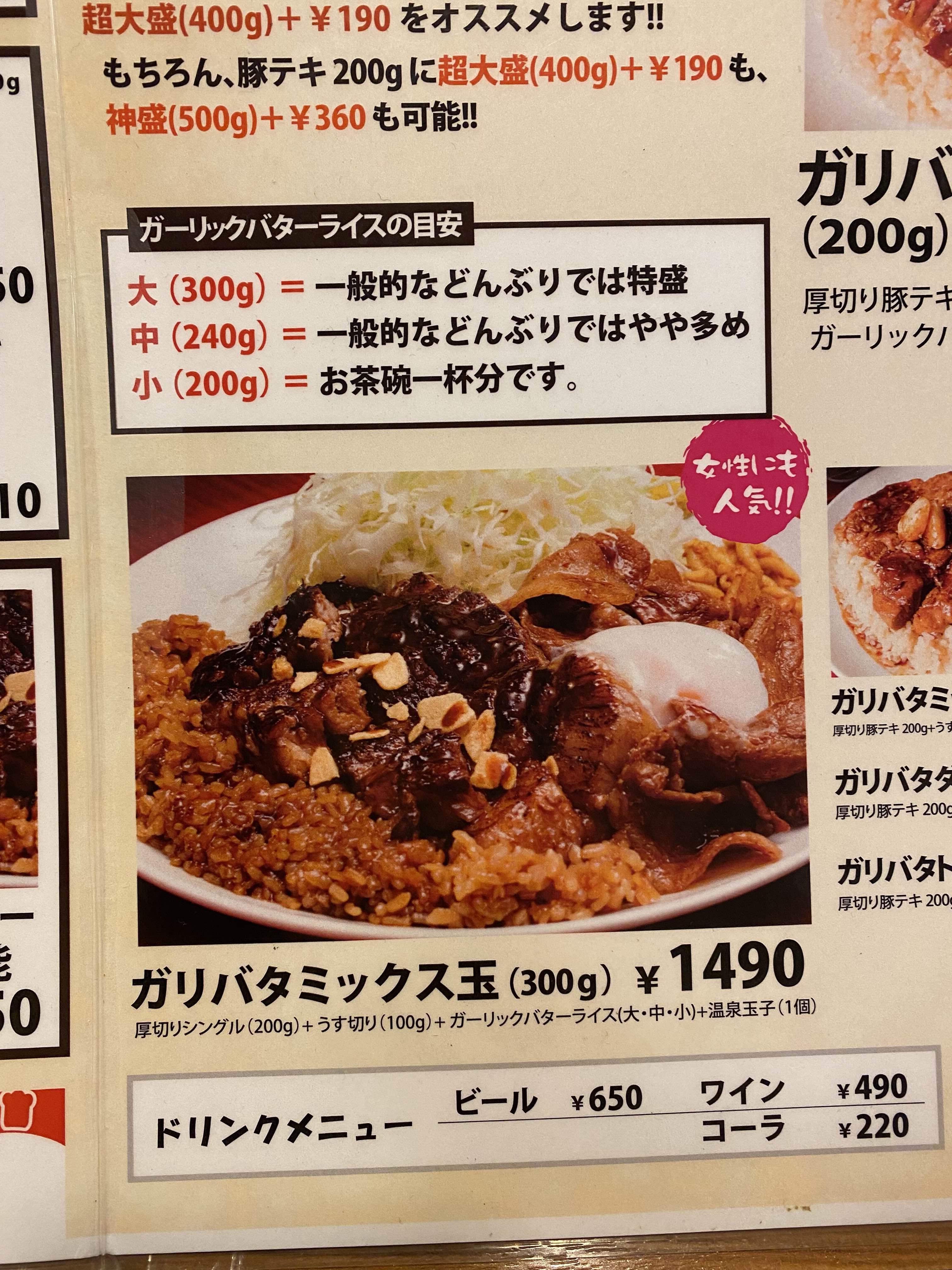 믹스(두툼한 고기 200g+ 얇게 썬 고기 100g)와 갈릭 버터 밥이 나오는 갈릭 버터 믹스 타마(ガリックバタミックス玉)도 인기가 많은 메뉴라 해요. 이 메뉴의 경우에는 주문 시 밥의 양을 고를 수 있고 리필은 불가능합니다.