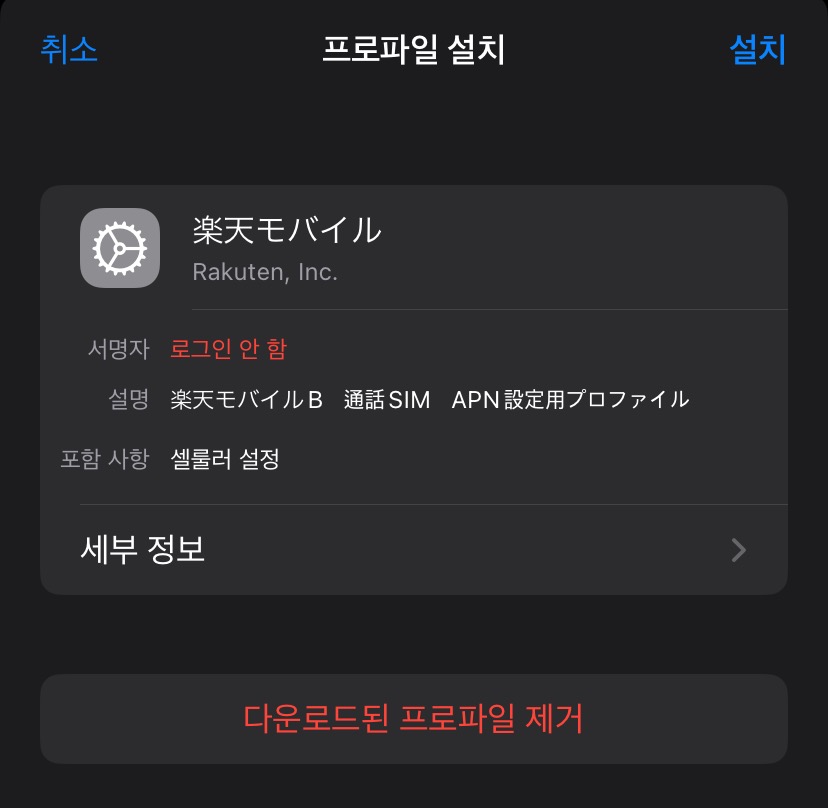 다운로드된 프로파일 클릭 후 오른쪽 상단의 설치 버튼 누르시면 수동 설치가 완료되었습니다. 이렇게 설정하시면 데이터 사용이 가능해집니다.